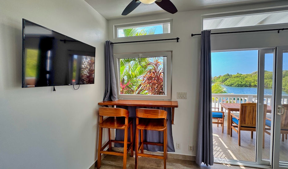 The Lionfish Villa is a one-bedroom with a queen-size bed and an ensuite bathroom. When you walk in, there is a private living area that leads into a functional kitchenette fit with an electric stove. There is a private patio accessible through the sliding glass door in the living area. The spectacular view from the private patio overlooks the pool on the water and further out into the never-ending ocean. Enjoy a quiet morning watching the sunrise.